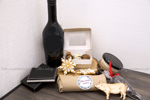 Новогодний презент с приятным кофейным вкусом и нежным ароматом. За такое качество отвечают несколько составляющих. Основной – бутылочка ирландского ликера Baileys, который прекрасен сам по себе и в роли добавки к другим напиткам. В наборе также есть шоколадная салями, имбирные пряники с сахарной глазурью, пряные шоколадные трюфели, орехи в темном шоколаде и шикарный десерт из трех видов шоколада. Да, последний заслуживает особого внимания: шоколадный бисквит и разнообразие муссов – это нечто! Рекомендуем набор «Бейлиз» в качестве подарка стильному мужчине, ему он точно понравится.