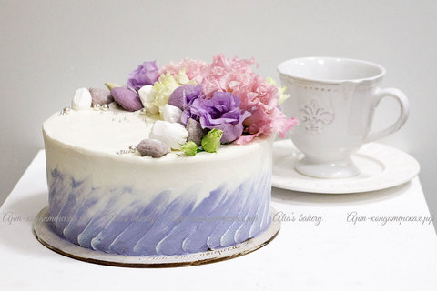 Легкость и свежесть альпийских лугов в палитре нежнейших пастельных оттенков. Нежный сиреневый крем, нанесенный небрежными мазками, создает эффект легкого ветерка, розовые и фиолетовые цветы словно растут на лужайке – создается удивительно воздушный образ и красивый десерт, который вызывает восторг у дегустирующих!