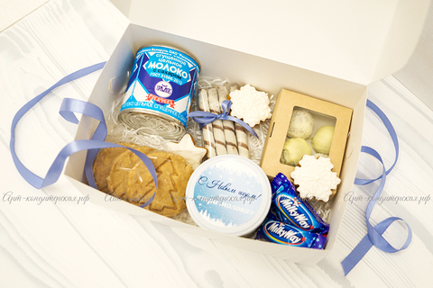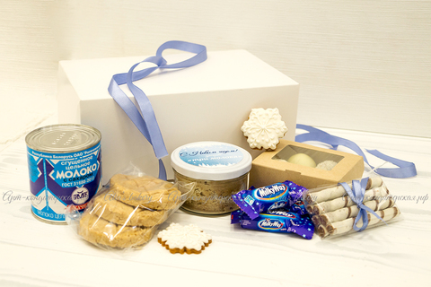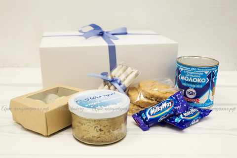 Любимые сладости со вкусом молока и шоколада, все в одном наборе! В большой и достаточно увесистой коробочке будет множество десертов, каждый придется по вкусу. Центральное место здесь занимает Рогачевская сгущенка, да, та самая-самая вкусная и густая. Сложно не заметить угощения производства нашей кондитерской: трюфели в белом шоколаде, нежное песочное печенье и самая настоящая шоколадная бомба – муссовый десерт «Три шоколада». Из вкусностей это не все: мини-milky way и трубочки с какао завершают сборку. Супернабор для сладкоежки!