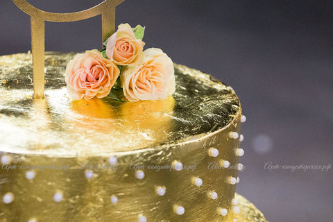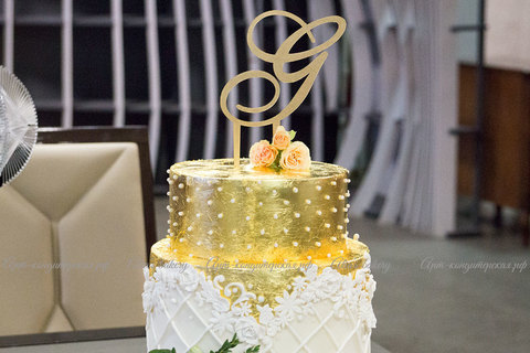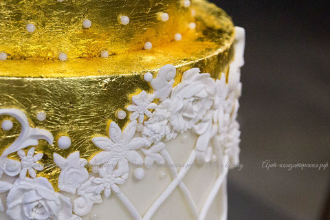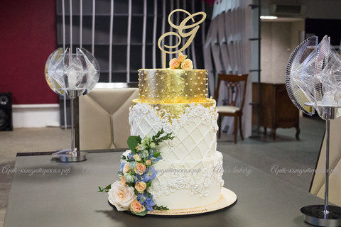 Драгоценный торт, который станет отличным украшением Вашего праздника! Классические атрибуты кондитерского декора в виде ажурных кремовых переплетений, жемчужные бусины и многообразие нежных цветов дополняются обильным декором из пищевого золота и топпером в тон. Невозможно налюбоваться и устоять перед этой красотой!