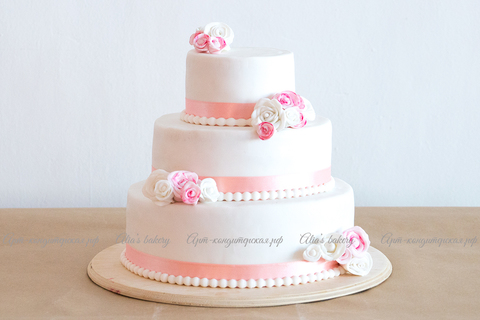 Элегантный десерт для подачи на изысканных торжествах! Торт, объединяющий в себе лучшие традиции декора сладких угощений, приятно удивляет потрясающим видом. Идеально ровное мастичное покрытие, атласные ленты, жемчужные ожерелья, нежные бутоны цветов шикарно украсят собой банкет в классическом стиле.