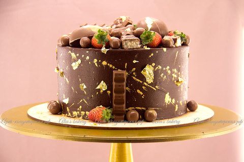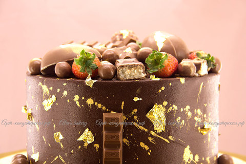 Когда есть множество идей и остановиться на чем-то одном невероятно сложно, достаточно сделать выбор в пользу привычных и всеми любимых сочетаний. Казалось бы, все стандартно и неоригинально, но это вовсе не так: вкуснейший шоколадный крем, многочисленные сладости из нуги и карамели, сочная клубника и золотой декор порадуют как при первой пробе!
