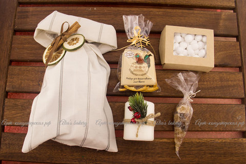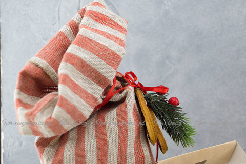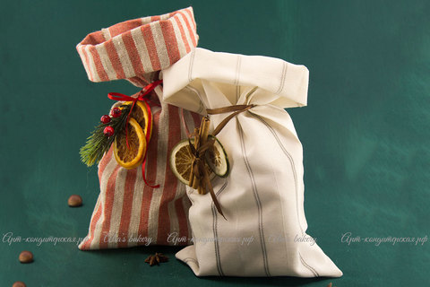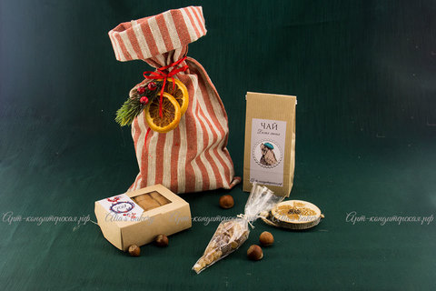 Заветный мешочек с подарком, а внутри – море сладостей! Фундук, песочное печенье и пряники, и красивая елочная игрушка ручной работы – чем не замечательный презент в канун любимого праздника? Порадуйте близких необычным сладким подарком! Креативный подход к выбору будет по достоинству оценен.