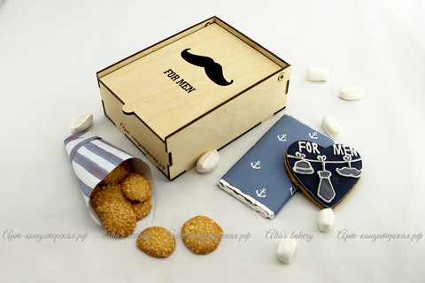 Подарочный набор, в котором есть все необходимое и самое вкусное: забавное печенье в милой упаковке, шоколадки, карамель и пряник-открытка. Все красиво, лаконично, практично и, по-мужски, без излишеств.