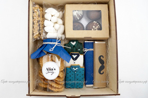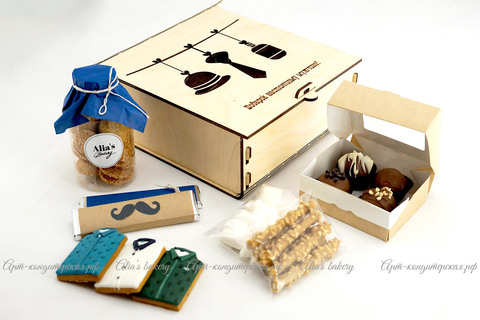 Пенал среднего размера. В набор входит: трюфели, шоколад, печенье с кунжутом, сладкая карамель, песочное палочки в шоколадной глазури с арахисом, 3 имбирных пряника. Минимальный заказ - 2 набора. Возможно брендирование и персонализация, бесплатно при заказе от 10 наборов.