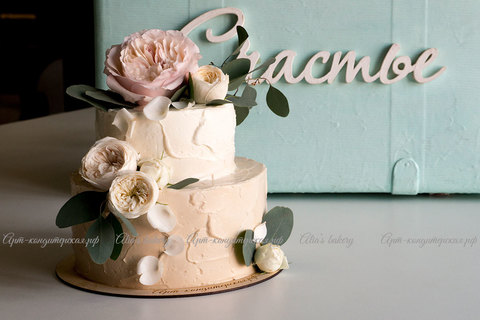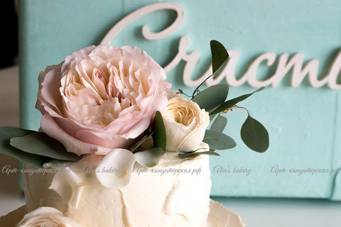 Нежнейший торт в пастельных тонах - лучшее украшение изысканного торжества! Воздушные бисквитные коржи, легкая кремовая прослойка и покрытие в сочетании с пионами, пионовидными розами, листочками эвкалипта создают невероятной красоты угощение! Гости будут в восторге!