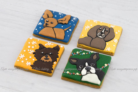 Имбирный пряник - обязательный новогодний атрибут, а пряник с изображением символа года - вдвойне удачный подарок! Яркий, колоритный, с забавными мордашками собачек различных пород, вкусный и ароматный благодаря меду и имбирю, он несомненно понравится тому, кому адресован: и друзьям, и коллегам, и знакомым, деткам и взрослым!