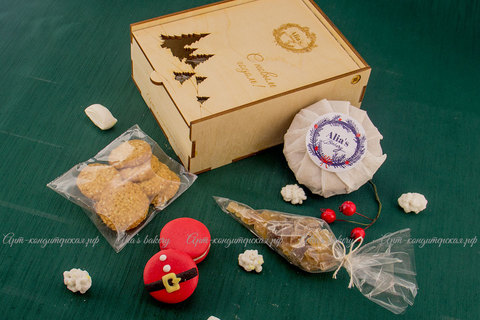 Хорошо вел себя в уходящем году? Получи вкуснейший подарок! Санта и его умелые помощники подготовили отличные презенты для каждого: в красивую декорированную коробочку-пенал положили различные виды печенья – песочное, с кунжутом и миндальное (макаронс) – и добавили горсть хорошего настроения. Волшебный подарок!