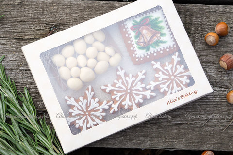 Сладкий предновогодний комплимент, дарящий ощущение праздника! Изящные пряничные снежинки и декорированный имбирный десерт вместе с арахисом в глазури из йогурта своим нежным вкусом и ароматом привносят тепло в холодный зимний день. Ведь такие угощения – лучшее дополнение к чашечке ароматного чая!