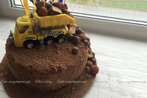 Отличный подарок мужчине-сладкоежке, который без ума от шоколада! Вкус этой сладости заставляет забыть обо всех проблемах, дарит отличное настроение и заряд энергии на весь день. Мы учли прекрасные свойства шоколада и соорудили для Вас настоящее какао-безумие, рассыпающееся из кузова игрушечного самосвала! Такой торт оставляет шикарное впечатление!