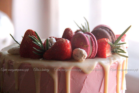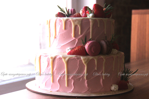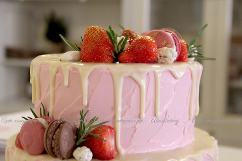 Аппетитный торт, покрытый вкуснейшим сливочным кремом, залитый шоколадным ганашем, украшенный большими ягодами клубники и любимыми макаронс, не останется без внимания приглашенной публики! Прелесть сладости и красоты композиции вызывает нереальный восторг!