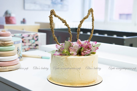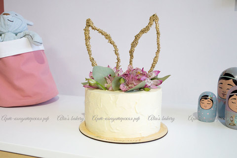 Необычное украшение создает яркий акцент всему угощению! Добавляем к белоснежной бисквитно-кремовой основе любимый многими цветочный декор, а затем дополняем композицию милейшими заячьими ушками, выполненными нестандартным способом - в результате получаем игривый, забавный торт, от которого будут в восторге и дети, и взрослые!