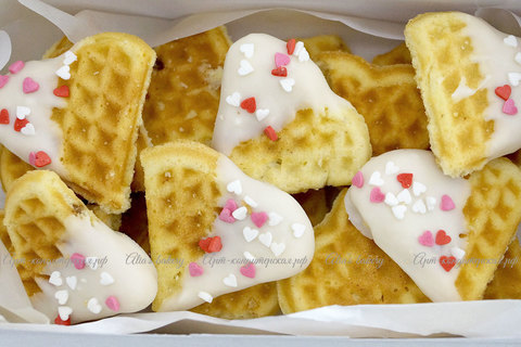 Коробочка радости! Внутри находятся вкуснейшие венские вафли с декором в виде сахарной глазури и шоколадной посыпки. От таких сладостей повышается настроение и с лица не сходит улыбка. Советуем брать на все праздники!