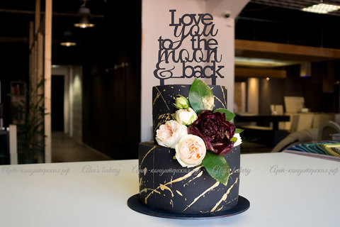 Темный торт с ярким акцентом – сочетание, обреченное на успех! Мастика черного цвета с золотыми небрежными вкраплениями выглядит очень необычно и стильно и создает прекрасную основу для остального декора. Крупные бутоны контрастного цвета завершают образ, делая торт максимально оригинальным и лаконичным.