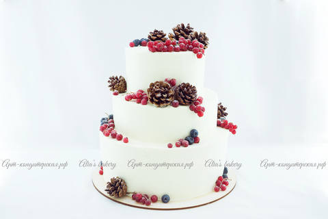 Ярусы, покрытые белоснежным кремом, украшенные зимними ягодами и шишками - самая настоящая зимняя сказка! Покрытый нетающей пудрой, словно припорошенный снегом десерт порадует всех приглашенных от мала, до велика, ведь устоять перед такой красотой и невероятным вкусом невозможно! Зимнего настроения и прекрасного торжества!